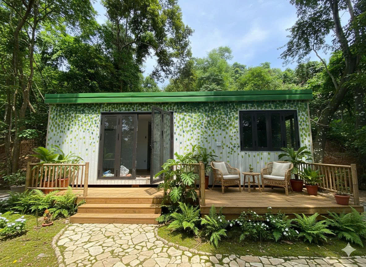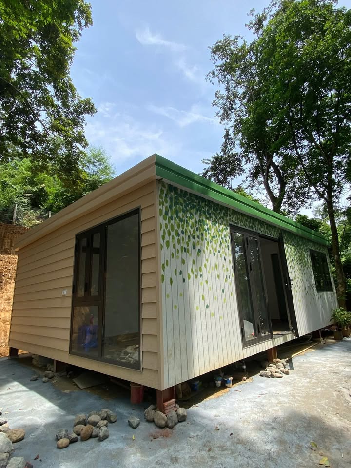 Ngôi nhà với tổng diện tích gần 54m2 được bàn giao cho chị khách hàng tại Thạch Thất với mục đích làm nhà nghỉ dưỡng cuối tuần để gia đình về nghỉ ngơi. Căn nhà được lắp ghép từ 3 module với mỗi module 18m2. Sử dụng khung thép tổ hợp theo công nghệ dây chuyền lắp ghép của Nhật Bản vô cùng vũng chãi có độ bền hơn 30 năm.